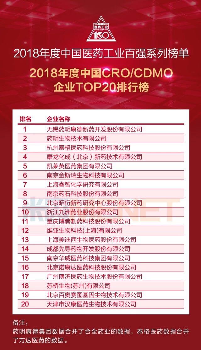 在2018年度中國(guó)CRO(含CDMO)企業(yè)TOP20排行榜中,藥明康德、藥明生物、泰格醫(yī)藥位列前三甲。